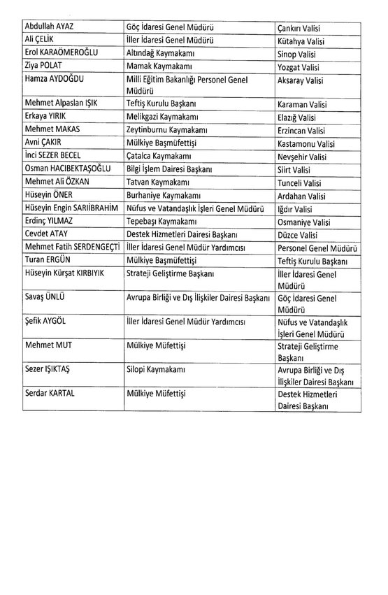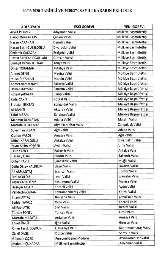 Edinilen son dakika bilgisine göre, Cumhurbaşkanlığı’nca Valiler Kararnamesi tamamlandı. İzmir ve Diyarbakır'ın da aralarında olduğu birçok ilin valisi değişti.Kararnameye göre 17 ilin valisi Mülkiye Başmüfettişi yapıldı. 24 ilin valisi başka illerde görevlendirildi. Bazı Kaymakamlar ve yüksek düzey bürokratlar vali olarak atandı. İşte, son dakika haberinin detayları ve o isimler...